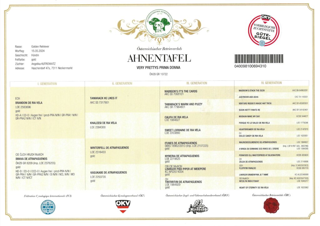 Gesundheit: HD B, ED 0, OCD Schulter frei, ÜW Typ 0, Augen frei, Scherengebiss, prcd-PRA, GR-PRA 1/2, OI, NCL, MD, ICT frei